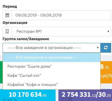 Если к вашей учетной записи привязано более одной организации - выбирите нужную в блоке Организация. Также в случае, если у вас на одном сервере более одного заведения - выбрать какое-то одно вы можете в блоке Группа залов/Заведение.